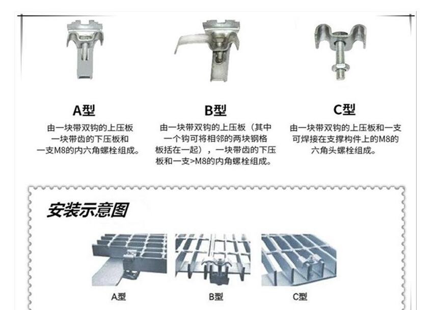 钢格板安装夹是用优质钢板经过机器折弯,打孔之后做成的,安装夹结实耐用,安装简便,镀锌后的安装夹美观牢固,且不易生锈,能够很好的固定钢格板。